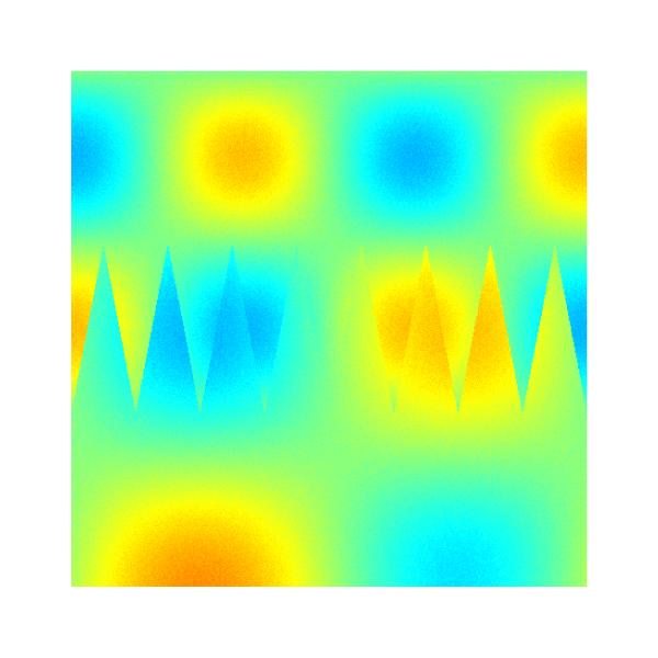 p.x[] = ( sq(y) + sin(2*pi*x)*cos(2*pi*y) + 0.1*noise())*f[] + (sin(3*pi*x)*cos(3*pi*y) + 0.1*noise())*(1-f[]);