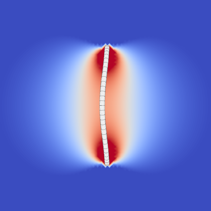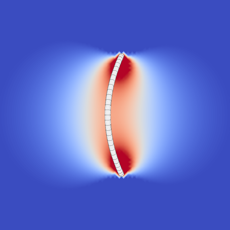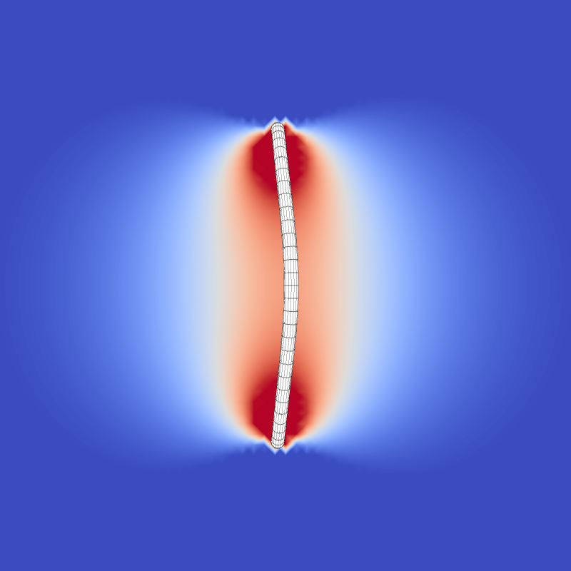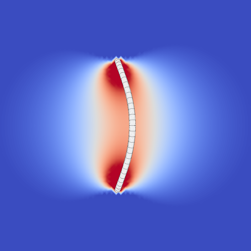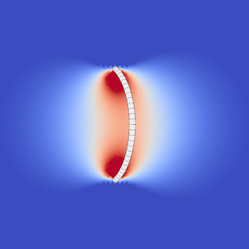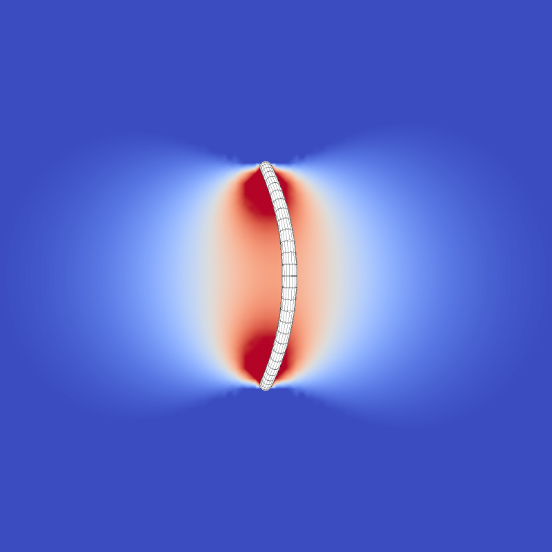 In this example, we’re going to create a simple solver for the equation above and compute the external field in the Eulerian grid. We’re also going to compare the motion of the ellipical vortex ring to the circular vortex ring. To this end, we’ll use the translational velocity of the circular vortex ring as \vec{U}_{\infty}.
